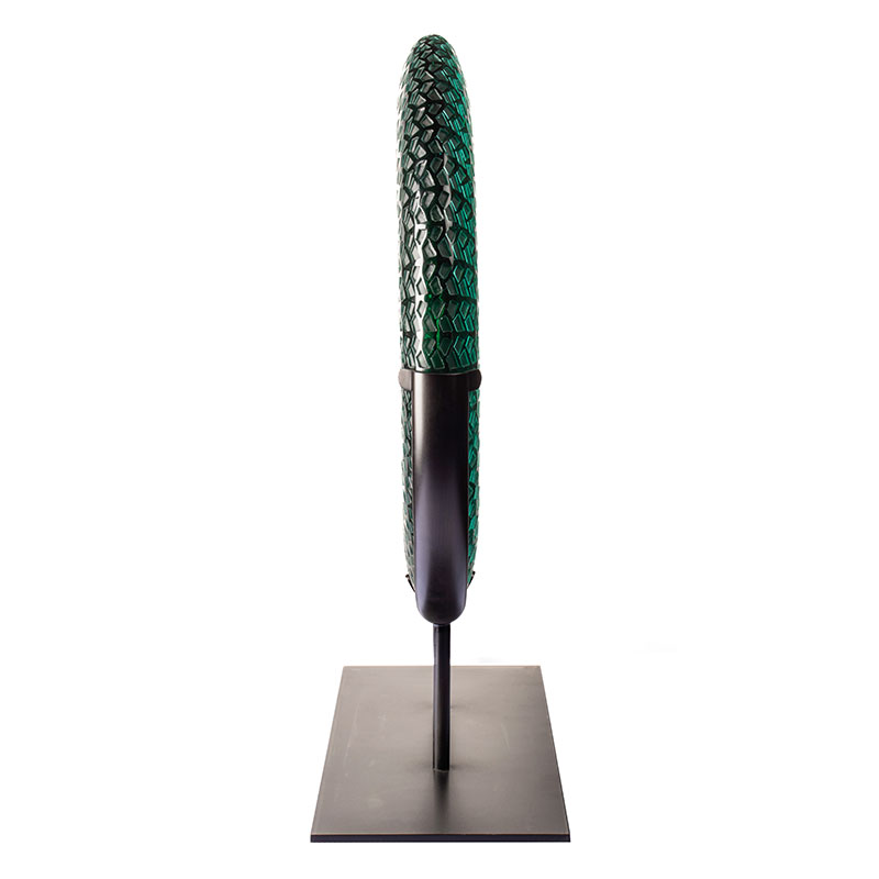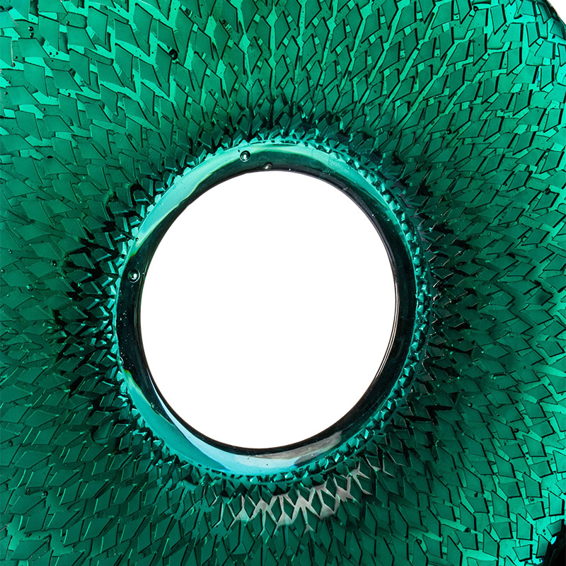 Praca wykorzystuje liście bambusa jako naturalną inspirację, oddając eterycznego ducha zielonego bambusa kołyszącego się w leśnej bryzie. Przez półprzezroczystość szkła przywołuje tysiące połyskujących odbić bambusa. Ten odcień zielonego błękitu ucieleśnia zarówno świeżość gajów bambusowych przed wyparowaniem porannej rosy, jak i łagodną łaskę upływu czasu. Skomplikowane wzory, niczym rozwijające się żyłki liści bambusa, falują warstwami światła tańczącego po powierzchni, oddając dzikiego ducha gór w okrągłej ramie.