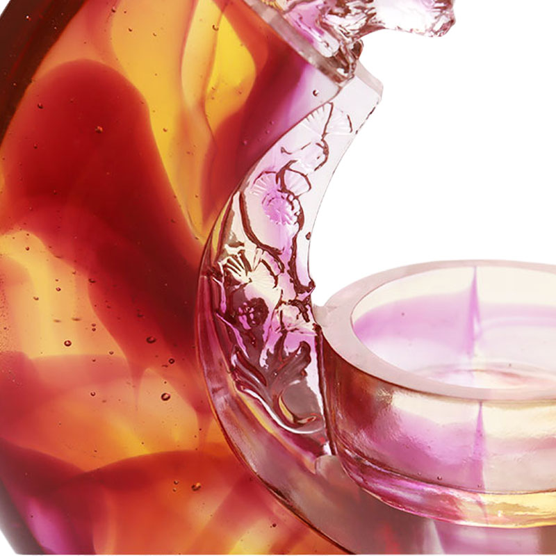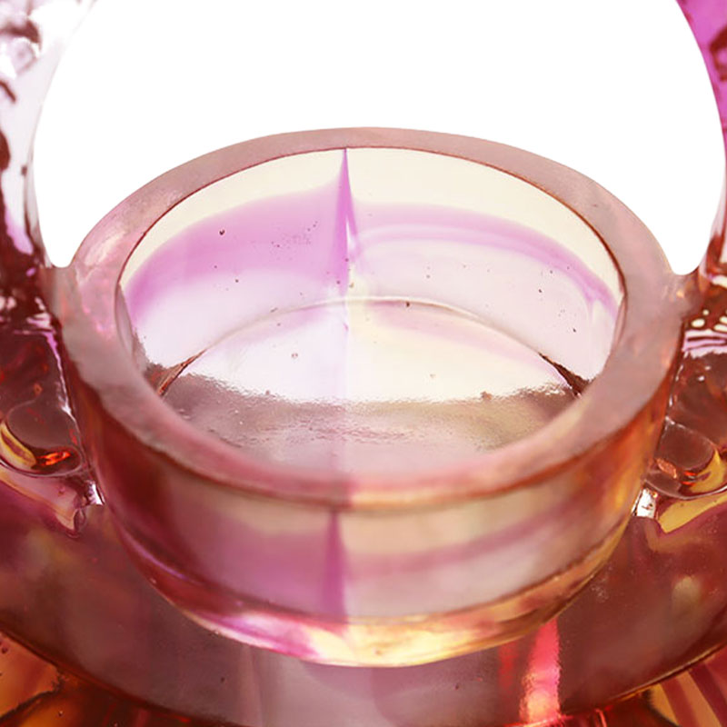 Kolorowy szkliwo nadaje świecznikowi zjawiskową fakturę. Jego kolory są tak wspaniałe jak zachód słońca. Kolory czerwony, żółty i fioletowy mieszają się ze sobą, a płynące kolory zdają się zatrzymywać czas w tej cudownej chwili. Przejście każdego koloru jest naturalne i płynne, ukazując niepowtarzalny urok kolorowej glazury. Kształt świecznika jest genialny, z wzorem w kształcie półksiężyca po obu stronach, gładkimi liniami i napięciem, jakby mówił elegancki rytm. Wykwintne rzeźby na szczycie są delikatne i żywe, niczym elfy strzegące blasku świecy, dodając całemu świecznikowi tajemniczości i zwinności. Część środkowa, w której umieszcza się świecę, jest znakomicie zaprojektowana, zarówno praktyczna, jak i piękna, i pożądane, aby wkomponowała się w ogólny kształt. Z rzemieślniczego punktu widzenia ten kolorowy świecznik z glazury odzwierciedla bardzo wysoki poziom produkcji. Przejrzystość i połysk kolorowej glazury zostały doprowadzone do perfekcji, a każdy szczegół jest dopracowany bez najmniejszych wad. Niezależnie od tego, czy zostanie użyty jako świecznik, czy też wystawiony jako niezależne dzieło sztuki, może emanować odurzającym urokiem i podkreślać wyjątkową wartość kolorowej sztuki szkliwnej.