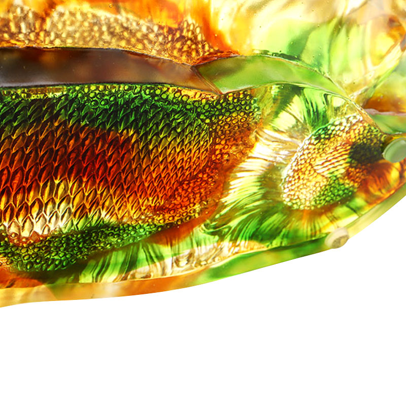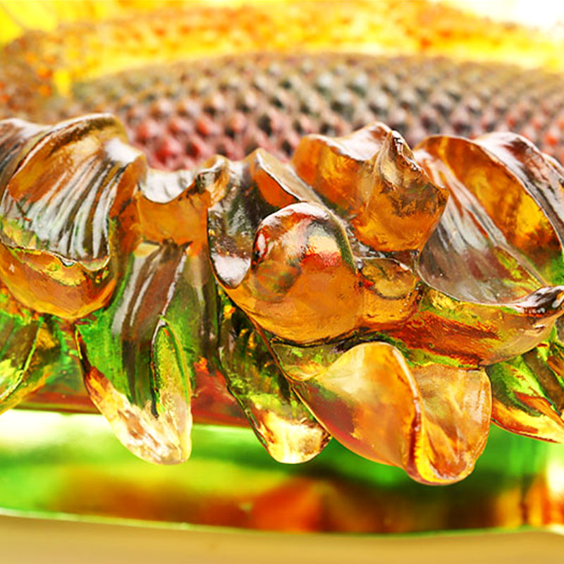 Kolorowa, szkliwiona płyta skierowana w stronę słońca wydaje się być skondensowana pod wpływem światła słonecznego. Każda linia na talerzu jest jak ślady pozostawione przez światło słoneczne na płatkach, lśniących złotym światłem. Znakomity kunszt sprawia, że ​​witalność i wigor słoneczników są na zawsze utrwalone w kolorowej glazurze. Czerwone owoce na talerzu są jasne jak płomienie, dodając odrobinę żywego koloru temu wykwintnemu talerzowi skierowanemu w stronę słońca. To nie tylko dzieło sztuki, ale także pożądane połączenie światła słonecznego i życia. Może emanować ciepłem i radością, jeśli zostanie umieszczony w cichym miejscu.